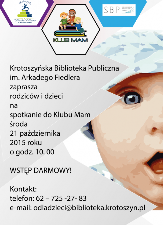 Krotoszyńska Biblioteka Publiczna im. Arkadego Fiedlera zaprasza na spotkanie Klubu Mam 21.10.2015r. ( środa) godzina 10.00 - Czytelnia dla Dzieci i Młodzieży, II piętro - poinformował portal krotoszyńskiego UM.