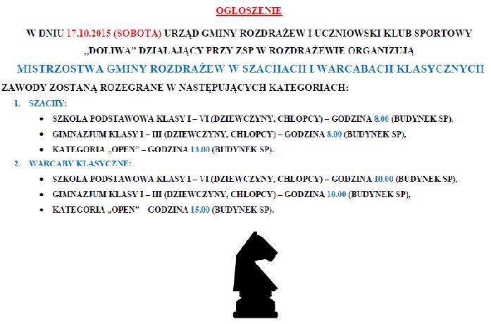 17 października (sobota) Urząd Gminy w Rozdrażewie (powiat Krotoszyn), USK „DOLIWA” przy ZSP w Rozdrażewie zapraszają na Mistrzostwa Gminy Rozdrażew w szachach i warcabach.