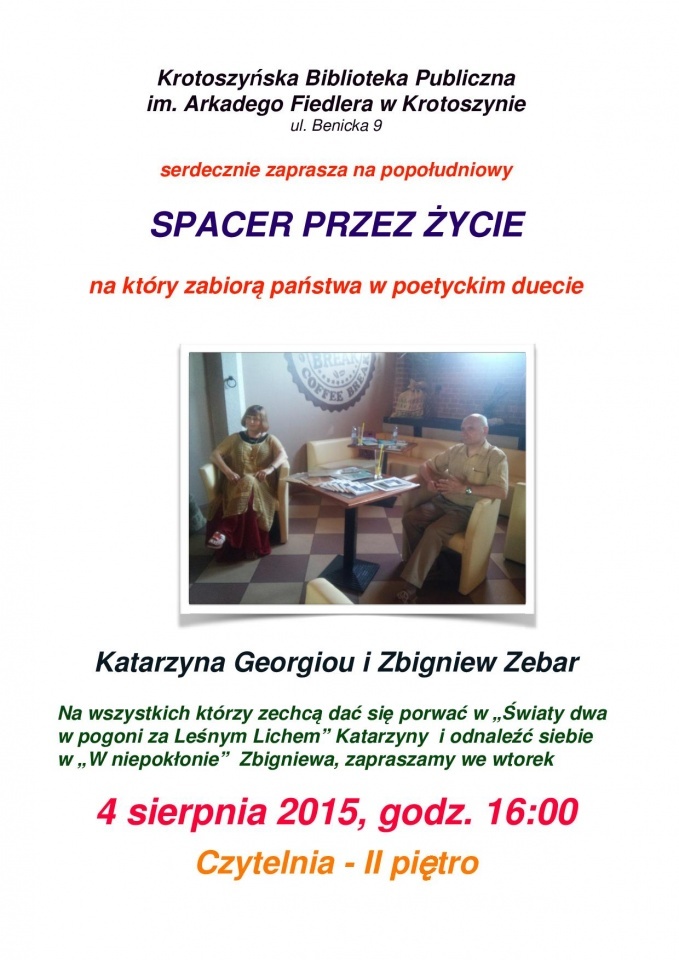 Krotoszyńska Biblioteka Publiczna im. Arkadego Fiedlera w Krotoszynie ul. Benicka 9 serdecznie zaprasza na popołudniowy SPACER PRZEZ ŻYCIE na który zabiorą państwa w poetyckim duecie Katarzyna Georgiou i Zbigniew Zebar.