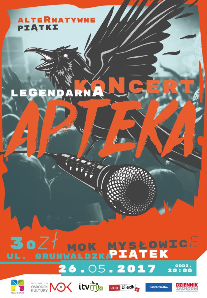 26 maja, o godz. 20:00 w sali widowiskowej MOK wystąpi znany ze swej ekscentryczności zespół "Apteka". Zespół Jędrzeja "Kodyma" Kodymowskiego, który początkowo miał być tylko rodzajem przewrotnego eksperymentu, alternatywnym sposobem spędzania czasu kumpli z liceum, wyrósł ponad swoje założenia stając się zespołem legendarnym, punktem odniesienia, wyróżnianym mianem kultu.