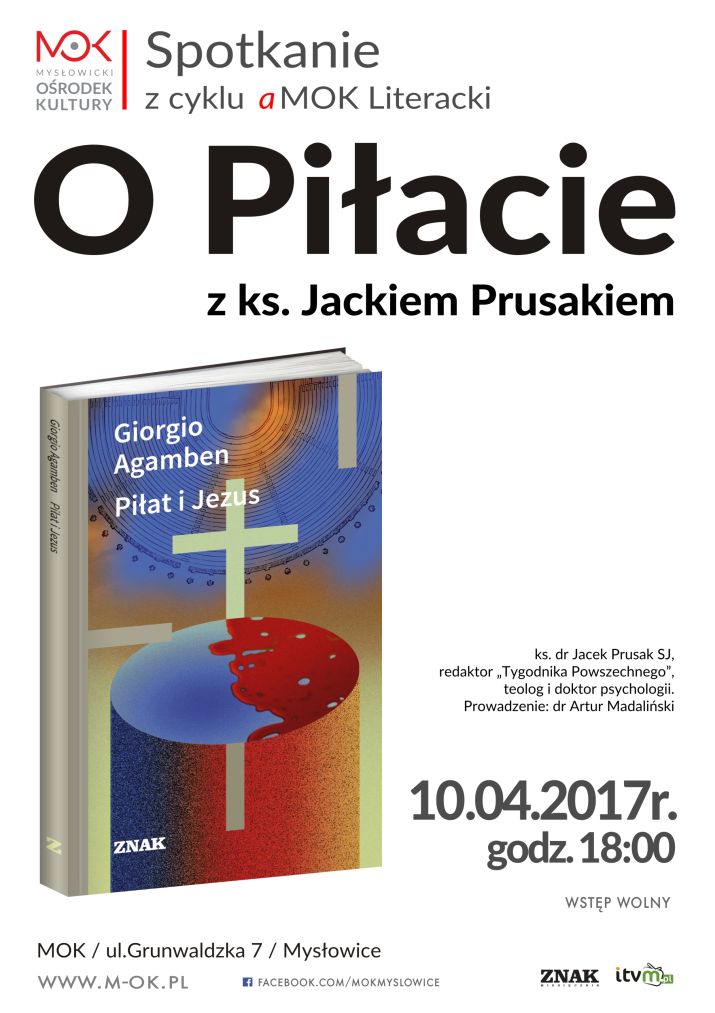 Gościem kwietniowego „aMOKu Literackiego” będzie ks. Jacek Prusak, jezuita, redaktor „Tygodnika Powszechnego”, teolog i doktor psychologii. Pretekstem do rozmowy będzie książka włoskiego filozofa Giorgio Agambena „Piłat i Jezus”.