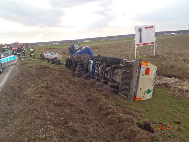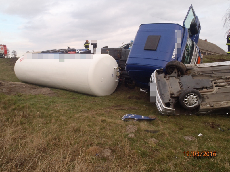 Do groźnie wyglądającego wypadku doszło w sobotę 19 marca 2016 roku w miejscowości Smoszew, gm. Krotoszyn. Doszło tam do zderzenia samochodu ciężarowego z naczepą przewożącego 20 ton azotu i samochodu osobowego z lawetą - poinformował portal Komendy Powiatowej PSP w Krotoszynie.