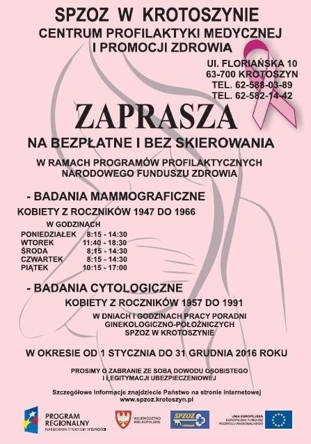 SPZOZ w Krotoszynie Centrum Profilaktyki Medycznej i Promocji Zdrowia zaprasza na bezpłatne i bez skierowania badania mammograficzne.
