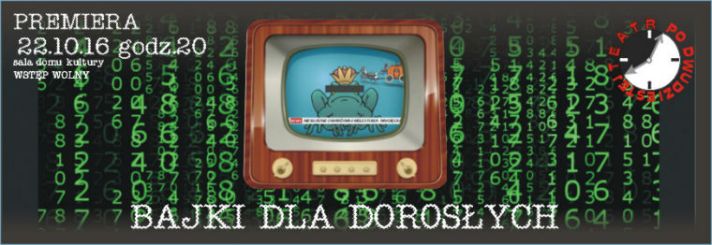 Premiera spektaklu „Bajki dla dorosłych” Teatru Po 20stej. Autorzy: Joanna Wilińska, Feliks Derecki, Andrzej Nowicki. Scenariusz i reżyseria: Ewa Kłujszo. Więcej: http://kulturalni.pl/kalendarz/event/238-bajki-dla-doroslych. (jkd)