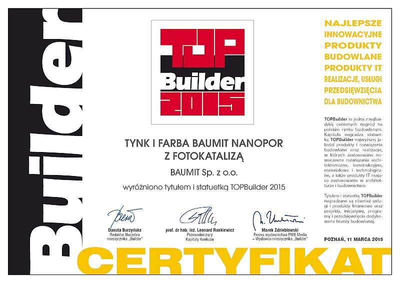 Rada programowa miesięcznika „Builder” i Kapituła wyróżnień TopBuilder jak co roku nagrodziła najwyższej jakości produkty i rozwiązania budowlane. Podczas Gali Finałowej, zorganizowanej 11 marca 2015 r. w ramach Międzynarodowych Targów BUDMA w Poznaniu, prestiżową statuetką uhonorowano innowacyjne produkty elewacyjne z nanotechnologią – tynk i farba Baumit Nanopor z fotokalitycznym efektem samooczyszczania.