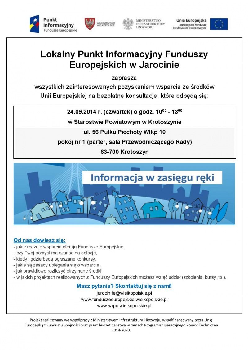 Lokalny Punkt Informacyjny Funduszy Europejskich w Jarocinie zaprasza wszystkich zainteresowanych pozyskaniem wsparcia ze środków Unii Europejskiej na bezpłatne konsultacje, które odbędą się:24.09.2014 r. (czwartek) o godz. 1000 - 1300 w Starostwie Powiatowym w Krotoszynie, ul. 56 Pułku Piechoty Wlkp. 10, pokój nr 1 (parter, sala Przewodniczącego Rady) - poinformował portal Starostwa Powiatowego w Krotoszynie.