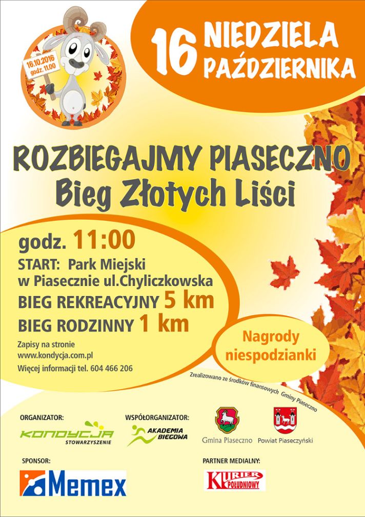 W dniu 16 października, o godz. 10:00 już po raz piąty w parku miejskim w Piasecznie odbędzie się "Bieg Złotych Liści".