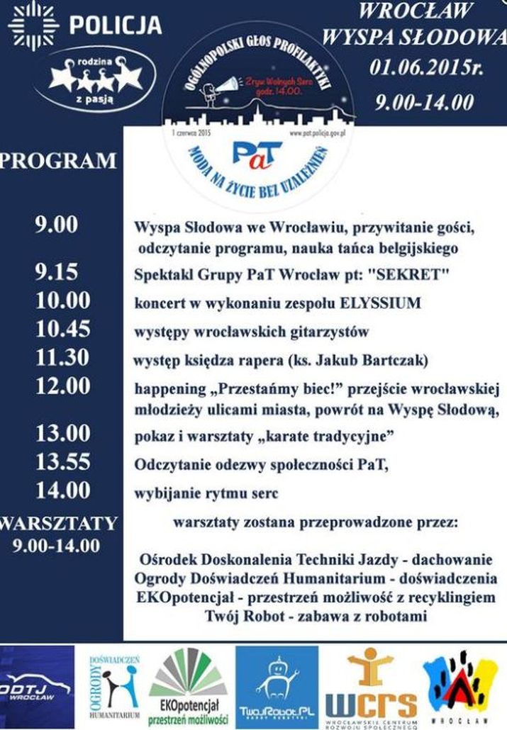 Główne obchody ”Ogólnopolskiego Głosu Profilaktyki” na Dolnym Śląsku, inspirowane przez Komendę Wojewódzką Policji oraz Komendę Miejską Policji we Wrocławiu, odbędą się we Wrocławiu na Wyspie Słodowej. O godz. 13:55 odczytana zostanie odezwa społeczności PaT (Profilaktyka a Ty), by chwilę później o godz. 14:00 nastąpiło wspólne wybijanie rytmu serc. Tylko 60 sekund. Tak niewiele, a znaczyć będzie tak bardzo dużo. (jkd)