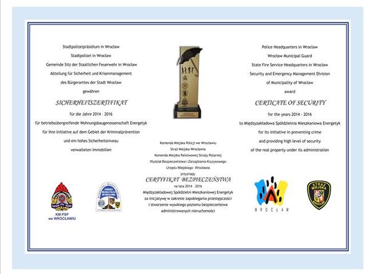 16 stycznia o godz. 12:00, w sali sesyjnej Urzędu Miejskiego we Wrocławiu, odbyła się uroczystość wręczenia „Certyfikatu bezpieczeństwa” Międzyzakładowej Spółdzielni Mieszkaniowej "Energetyk" za przedsięwzięcia realizowane na rzecz podniesienia poziomu bezpieczeństwa mieszkańców osiedla.