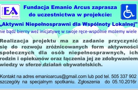 Realizacja projektu „Aktywni Niepełnosprawni dla Wspólnoty Lokalnej” ma za zadanie przyczynić się do rozwoju zróżnicowanych form aktywności społecznej osób niepełnosprawnych, ich rodzin i opiekunów oraz łączenia jej ze zdobywaniem wiedzy w sferze działań obywatelskich.