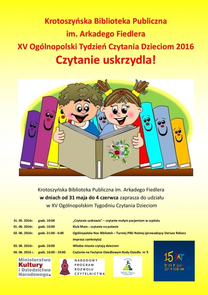 W dniach od 31 maja do 4 czerwca 2016 roku Krotoszyńska Biblioteka Publiczna im. Arkadego Fiedlera zaprasza do udziału w XV Ogólnopolskim Tygodniu Czytania Dzieciom "Czytanie iskrzydla" - poinformował portal krotoszynskiego magistratu.