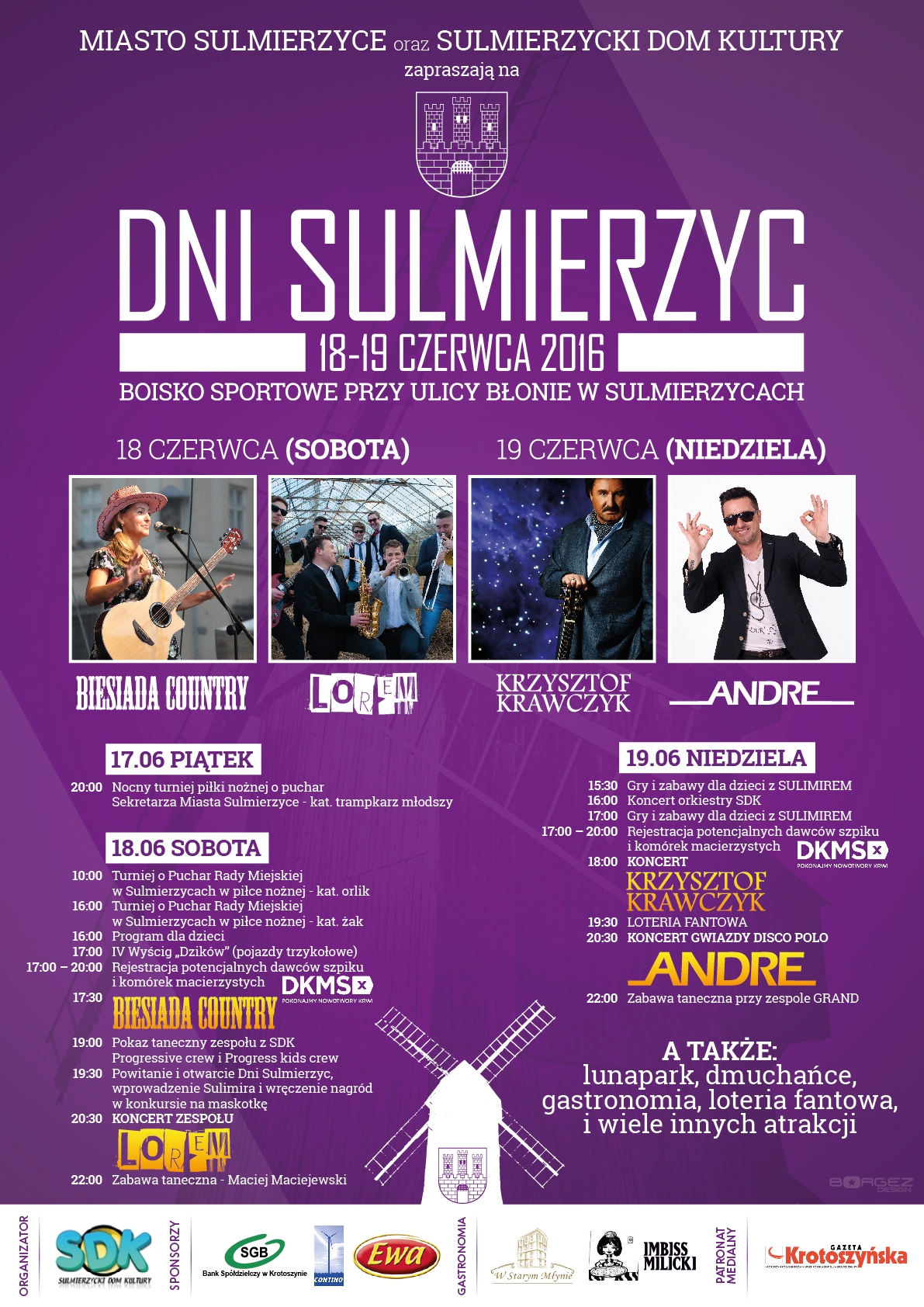 Miasto Sulmierzyce (powiat krotoszyński) oraz Sulmierzycki Dom Kultury zapraszają na Dni Sulmierzyc, które odbędą się 18 - 19 czerwca na boisku sportowym w Sulmierzycach. W programie między innymi nocny turniej piłki nożnej o puchar sekretarza miasta Sulmierzyce (kategoria trampkarz młodszy), turniej w piłki nożnej (kategoria orlik i żak) o puchar Rady Miasta liczne zabawy dla dzieci oraz Biesiada Country i koncert Krzysztofa Krawczyka.