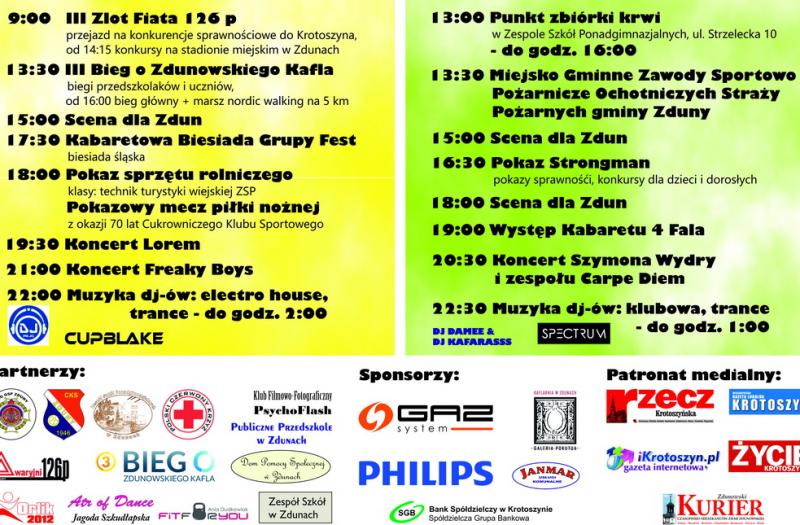 25 i 26 czerwca na stadionie miejskich w Zdunach (powiat Krotoszyn) odbędą się dni miasta. Wydarzenia towarzyszące Dniom Zdun to: III Zlot Fiata 126 p - sobota, od godz. 9:00 do 11:00 rejestracja uczestników i powitanie, wyjazd na paradę do Krotoszyna, gdzie na targowisku miejskim rozegrane zostaną konkurencje sprawnościowe. Powrót "maluchów" do Zdun przewiduje się na godz. 15:00. Pół godziny później odbędą się konkursy, po których nastąpi wręczenie nagród - ok. godz. 17:00 - poinformował portal UMiG w Zdunach.