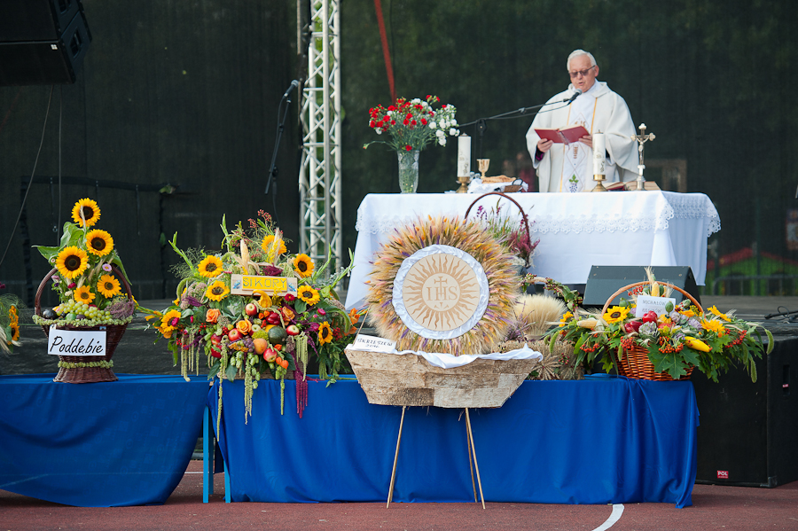 Tuż przed rozpoczęciem mszy świętej sołectwa zaniosły przed ołtarz wieńce a Starości chleb dożynkowy. Następnie odbyło się nabożeństwo celebrowane przez proboszcza Parafii Wniebowzięcia Najświętszej Maryi Panny w Chotomowie ks. prałata Leszka Kołonieckiego.