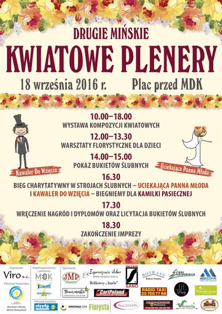 18 września, na placu przed MDK w Mińsku Mazowieckim odbędzie się kolejna plenerowa wystawa florystyczna - Drugie Mińskie Kwiatowe Plenery oraz bieg charytatywny w strojach ślubnych "Uciekająca Panna Młoda" i "Kawaler do wzięcia".