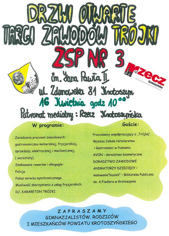 Zespół Szkół ponadgimnazjalnych nr 3 im. Jana Pawła II w Krotoszynie organizuje Drzwi Otwarte, Targi Zawodów Trójki. Impreza odbędzie się 16 kwietnia 2016 roku w siedzibie szkoły przy ulicy Zduńskiej 81 - poinformował portal krotoszyńskiego ZSP nr 3.