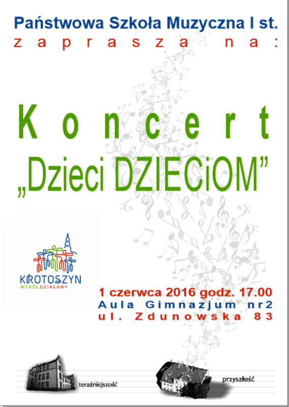 Państwowa Szkoła Muzyczna I stopnia w Krotoszynie zaprasza na koncert -„Dzieci DZIECIOM”, który obędzie się 1 czerwca 2016 roku o godz. 17:00 w Auli Gimnazjum nr 2 przy ul. Zdunowskiej 83 w Krotoszynie - informuje portal krotoszyńskiego ratusza.