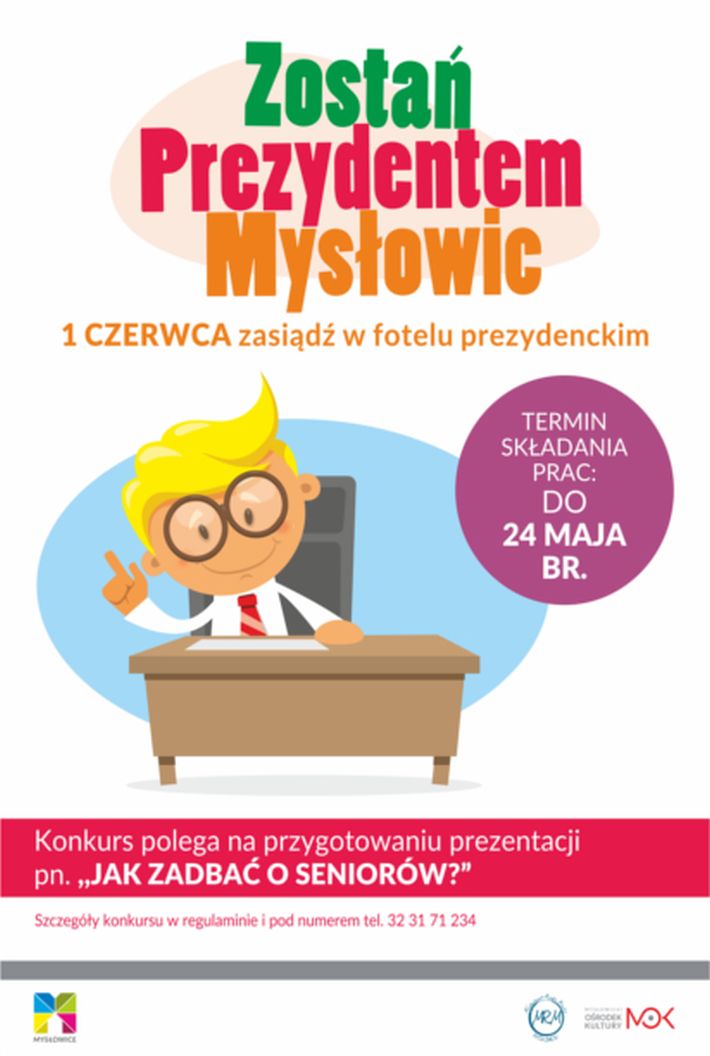 Młodzież z mysłowickich gimnazjów i szkół ponadgimnazjalnych walczyć będzie o pełnienie funkcji Młodzieżowego Prezydenta Miasta Mysłowice w dniu 1 czerwca, a jej zadaniem będzie opracować temat „Jak zadbać o seniorów?” Uczniowie będę musieli zaproponować działania, dzięki którym Mysłowice staną się miastem jeszcze bardziej przyjaznym seniorom. Prace nadsyłamy do 24 maja (Urząd Miasta Mysłowice, ul. Powstańców 1), a zwycięzcę poznamy 29 maja.