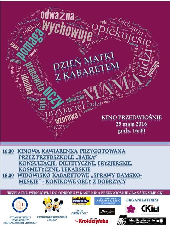 Zapraszamy na Dzień Matki z kabaretem, który odbędzie się 25 maja o godz. 16:00 w sali Kina 3D Przedwiośnie. Podczas imprezy uruchomiona zostanie kawiarenka przygotowana przez Publiczne Przedszkole BAJKA oraz konsultacje: fryzjerskie, kosmetyczne, lekarskie i dietetyczne. O godz. 18:00 odbędzie się widowisko kabaretowe "Sprawy damsko-męskie" w wykonaniu Konikowych Orłów z Dobrzycy. Rozstrzygnięty zostanie również konkurs fotograficzny "Zdjęcie z mamą" a na ścianach w holu kina obejrzeć będzie można prace dzieci z ich mamami powstałe na zajęciach w Krotoszyńskim Ośrodku Kultury - poinformował portal krotoszyńskiego ratusza.