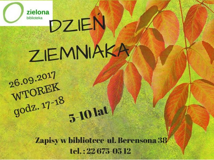 Biblioteka Publiczna w dzielnicy Białołęka m.st. Warszawy zaprasza 26 września, o godz. 17:00 dzieci w wieku 5-10 lat na Dzień Ziemniaka. Zapisy w bibliotece przy ul. Berensona 38 lub pod numerem telefonu 226750512.