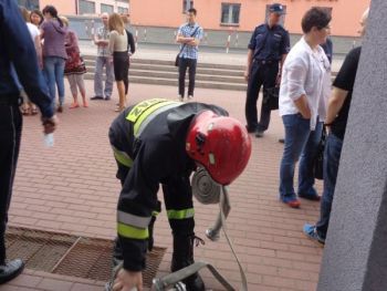 W budynku Komendy Powiatowej Policji w Żaganiu, w aneksie kuchennym na I piętrze, doszło do zwarcia instalacji elektrycznej i pożaru. Komendant Powiatowy Policji w Żaganiu podjął decyzję o ewakuacji… Uff! To tylko ćwiczenia.