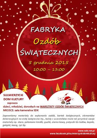 Sulmierzycki Dom Kultury zaprasza dzieci, młodzież i dorosłych na warsztaty ozdób świątecznych, które odbędą się 5 grudnia, w godz. 10.00 - 13.00 w sali kameralnej SDK.