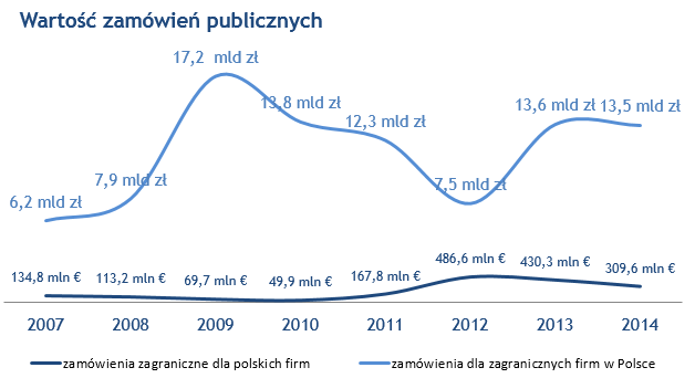 13,5 mld zł. Zamówienia publiczne w Polsce o takiej wartości zdobyły w 2014 roku zagraniczne firmy, podczas gdy polskie firmy za granicą wywalczyły kontrakty o wartości zaledwie 1,25 mld zł - podaje portal Money.pl. Taka rażąca dysproporcja utrzymuje się od lat.