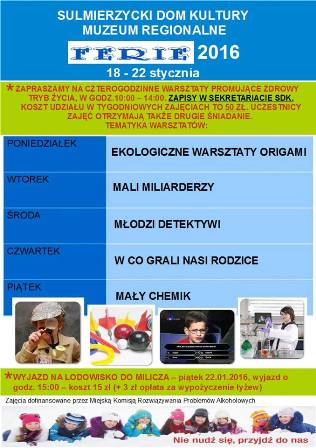 W dniach 18 -22 stycznia Sulmierzyckim Domu Kultury organizowane będą warsztaty promujące zdrowy tryb życia. Zajęcia będą odbywać się w godzinach 10.00 -14.00. Koszt udziału w zajęciach - 50 złotych.
