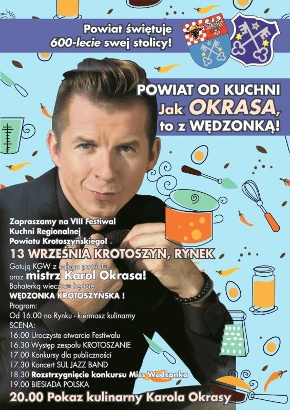 Serdecznie zapraszamy mieszkańców powiatu krotoszyńskiego na VIII Festiwal Kuchni Regionalnej Powiatu Krotoszyńskiego „Jak OKRASA to z wędzonką”, który odbędzie się w niedzielę 13 września na krotoszyńskim rynku - informuje portal krotoszyńskiego magistratu.