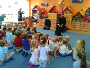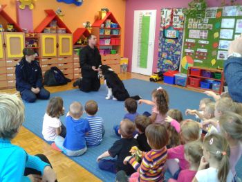 6 listopada, st. sierż Alicja Wiącek i Magdalena Łuba z fordońskiego komisariatu oraz strażnik miejski Krzysztof Gawrych wraz z psem służbowym Walkerem gościli w Przedszkolu Niepublicznym „Bajka” w Bydgoszczy, mieszczącym się przy ul. Szczęśliwej 7.
