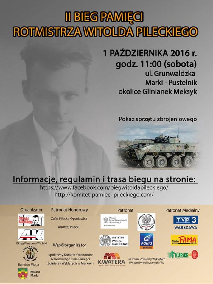 Zapraszamy na II Bieg Pamięci Rotmistrza Witolda Pileckiego, który odbędzie się w Markach dnia 1 października, o godz. 11:00. W ramach imprezy odbędzie się również "Bieg służb mundurowych". Więcej informacji na stronach internetowych podanych na plakacie.