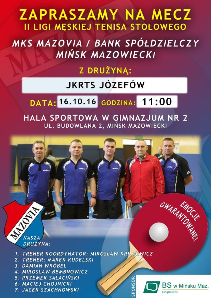 16 października, o godz. 11:00 zapraszamy na Mecz Tenisa Stołowego - MKS Mazovia/Bank Spółdzielczy - JK RST Józefów.