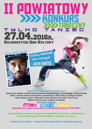 Zespół Szkół Publicznych w Sulmierzycach zaprasza uczniów szkół powiatu krotoszyńskiego i ostrowskiego do udziału w II Powiatowym Konkurskie Tanecznym. Impreza odbędzie się 27 kwietnia 2016 roku w Sulmierzyckim Domu Kultury.