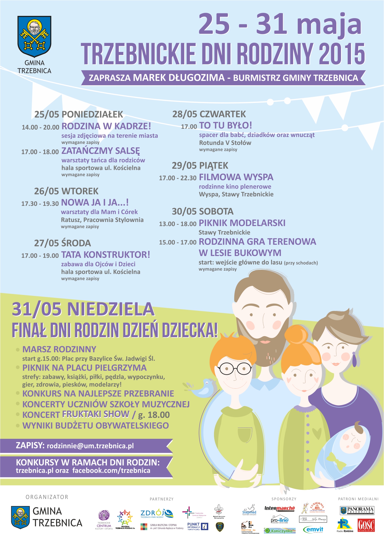 Liczne warsztaty tematyczne i konkursy, gra terenowa zorganizowana przez harcerzy w Lesie Bukowym, kino plenerowe i profesjonalna sesja zdjęciowa, warsztaty wizerunkowe dla mam i córek, archeologiczna gra w przestrzeni miasta dla dziadków i wnuków, warsztaty taneczne oraz wiele innych – tak będą wyglądały II Trzebnickie Dni Rodziny. Przez siedem dni – od 25 do 31 maja zarówno rodzice, dzieci jak i dziadkowie z pewnością znajda coś dla siebie. Cały projekt zakończy się Dniem Dziecka, podczas którego promować będziemy zdrowy tryb życia oraz aktywne, rodzinne spędzanie wolnego czasu.
