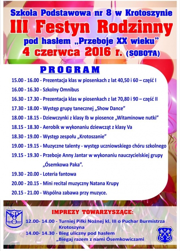 Szkoła Podstawowa nr 8 w Krotoszynie zaprasza na III Festyn Rodzinny, który odbędzie się 4 czerwca 2016 roku pod hasłem "Przeboje XX Wieku" - poinformował krotoszyński ratusz.