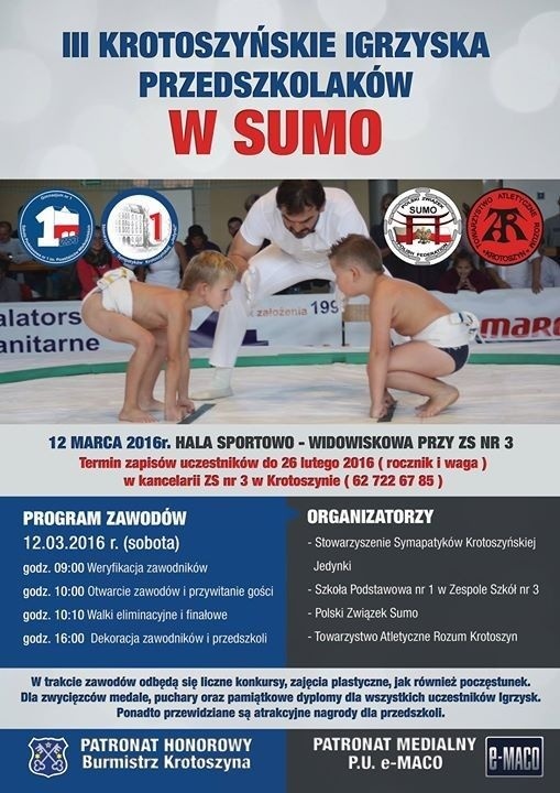 Stowarzyszenie Sympatyków Krotoszyńskiej Jedynki, Szkoła Podstawowa nr 1 w Zespole Szkół nr 3, Polski Związek Sumo oraz Towarzystwo Atletyczne Rozum Krotoszyn zapraszają na III Krotoszyńskie Igrzyska Przedszkolaków w Sumo.