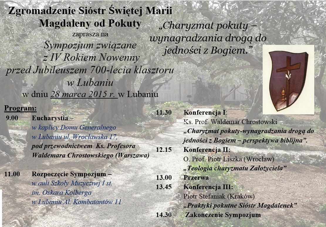 Za pięć lat Lubań będzie świętował 700-lecie bytności Zgromadzenia Magdaleńskiego. 28 marca (sobota) br. zapraszamy na sympozjum związane z IV Rokiem Nowenny przed Jubileuszem 700-lecia klasztoru w Lubaniu.
