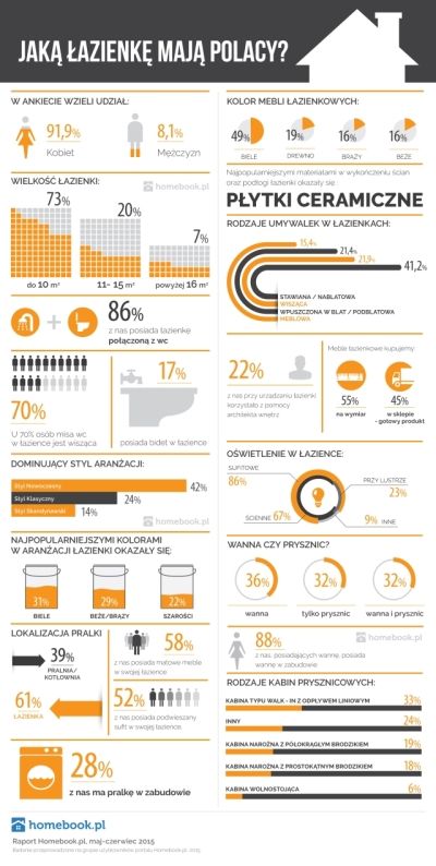 Wyniki przeprowadzonego przez Homebook.pl badania dają aktualny obraz polskich łazienek. Według raportu są one stosunkowo niewielkie, połączone z toaletą, utrzymane w jasnych kolorach odzwierciedlających nowoczesny styl pomieszczenia. Polacy rzadko decydują się na użycie innego materiału do wykończenia ścian i podłóg niż płytki ceramiczne. Wanny i prysznice są wybierane przez zbliżoną ilość Polaków. Co ciekawe - zaledwie 22% ankietowanych przyznało się do współpracy z architektem podczas aranżacji łazienki. Oznacza to, że większość z nas opiera się na własnym guście i natchnieniu zaczerpniętym z otoczenia. Szeroki wachlarz inspiracji oraz porad aranżacyjnych dostępny jest na największym polskim portalu wnętrzarskim Homebook.pl. -