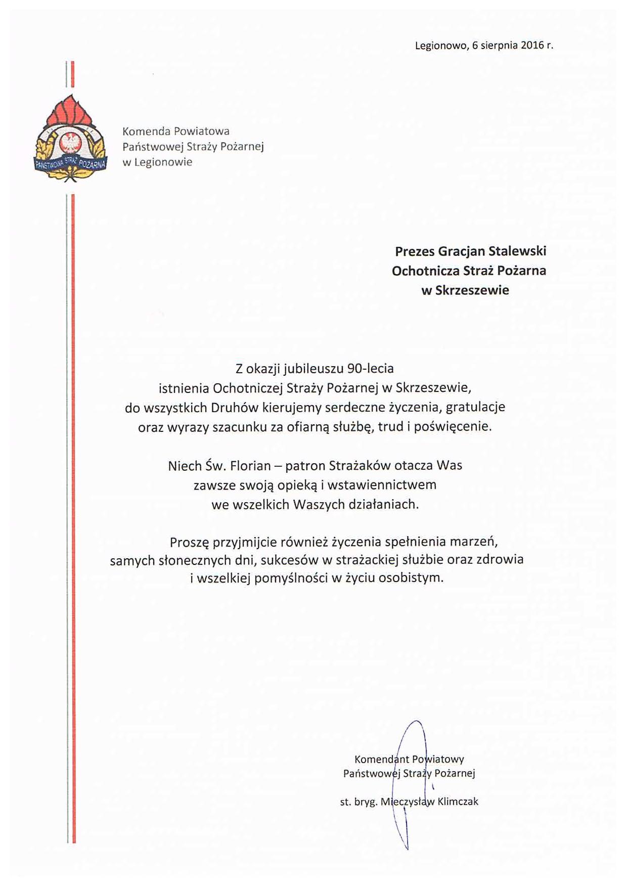 Z tej okazji st.bryg. Mieczysław Klimczak, Komendant Powiatowy Państwowej Straży Pożarnej w Legionowie skierował pismo do Gracjana Stalewskiego, prezesa Ochotniczej Straży Pożarnej w Skrzeszewie.