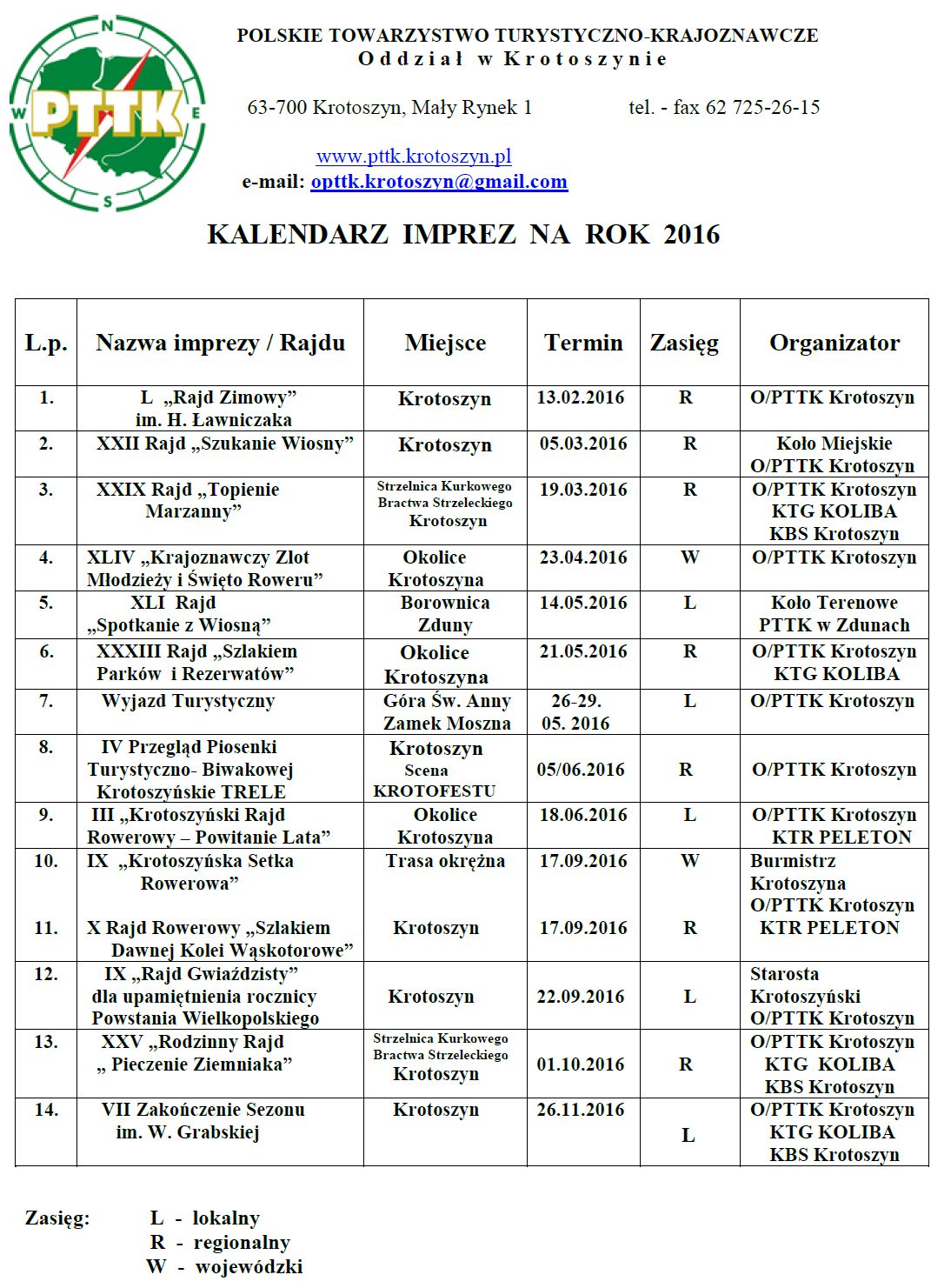Polskie Towarzystwo Turystyczno-Krajoznawcze Oddział w Krotoszynie przedstawia KALENDARZ IMPREZ NA ROK 2016.