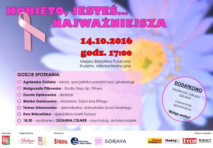 14 października, o godz. 17:00 zapraszamy na spotkanie „Kobieto, jesteś… najważniejsza”, które odbędzie się w sali konferencyjnej Miejskiej Biblioteki Publicznej w Wołominie.