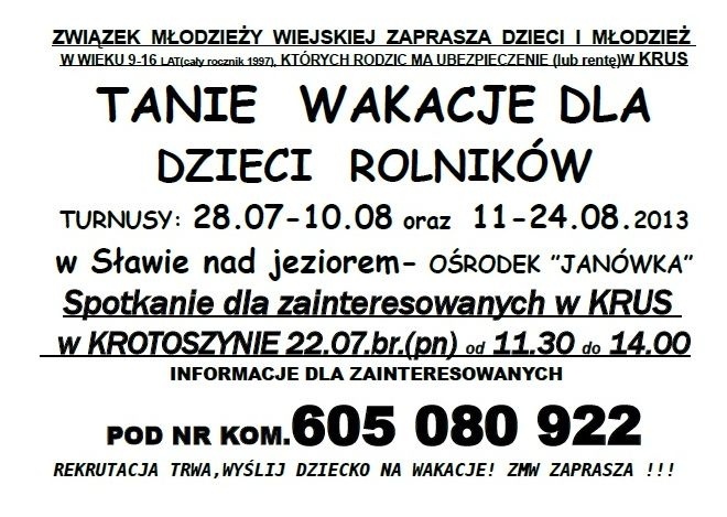 Kolonie organizowane przez Związek Młodzieży Wiejskiej w Sławie (woj.lubuskie) dla dzieci i młodzieży, których rodzic posiada ubezpieczenie w pełnym zakresie w KRUS albo pobiera świadczenie rentowe lub rehabilitacyjne z KRUS - poinformował portal www.muzeum.krotoszyn.pl.