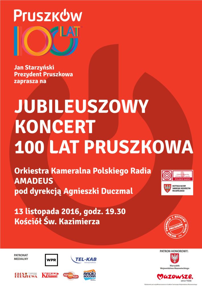 Wystąpi Orkiestra Kameralna Polskiego Radia Amadeus pod dyrekcją Agnieszki Duczmal. W programie: Ludwig van Beethoven - Sonata Księżycowa, Joseph Haydn - Koncert wiolonczelowy C-dur, Modest Musorgski - Obrazki z wystawy. Koncert będzie zwieńczeniem obchodów 100 lat praw miejskich Pruszkowa.