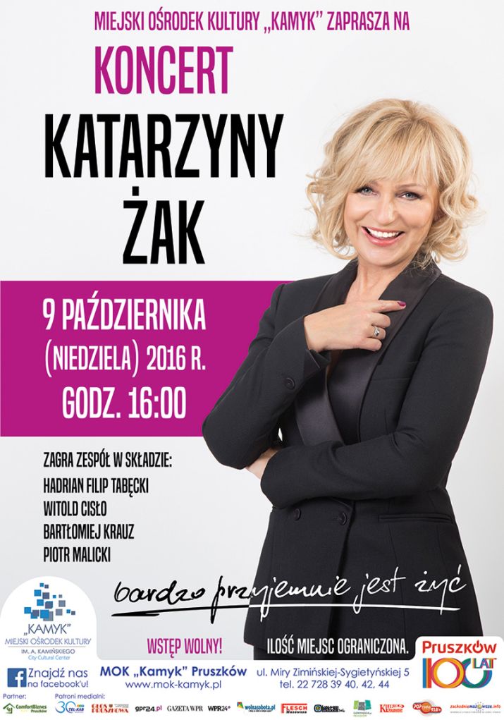 Miejski Ośrodek Kultury im. A. Kamińskiego w Pruszkowie zaprasza 9 października, o godz. 16:00 na koncert Katarzyny Żak "Bardzo przyjemnie jest żyć".