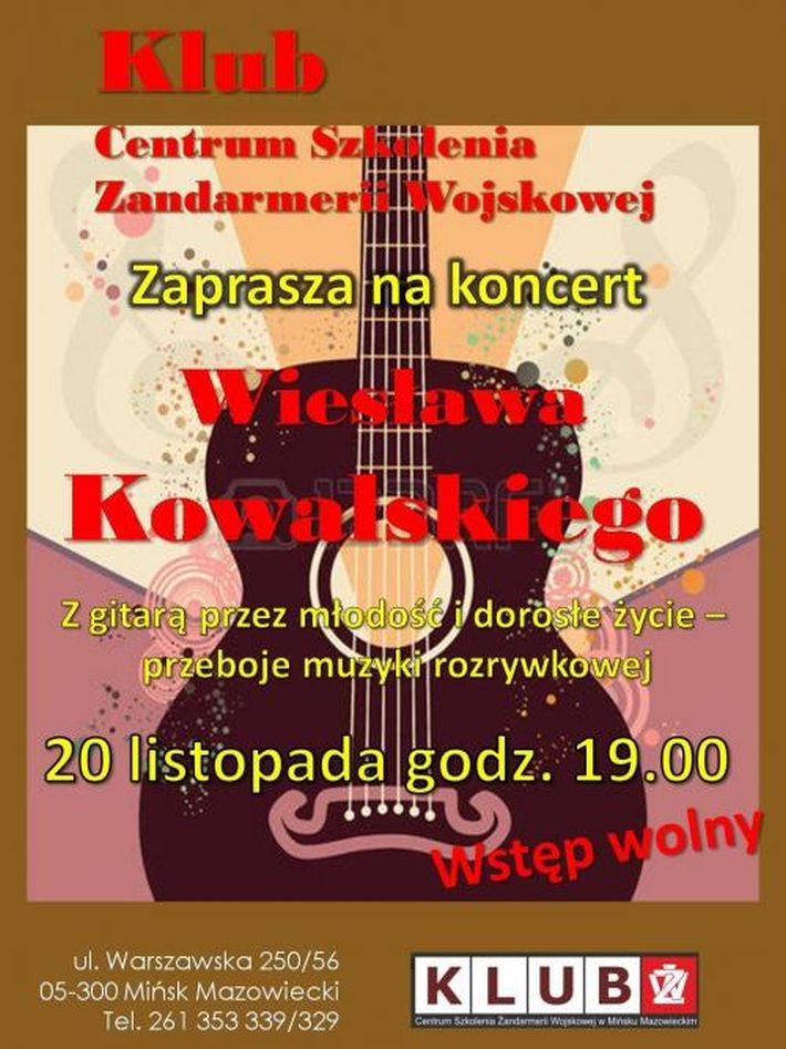 Klub Centrum Szkolenia Żandarmerii Wojskowej w Mińsku Mazowieckim zaprasza 20 listopada, o godz. 19:00 na koncert przebojów muzyki rozrywkowej. Wstęp wolny.