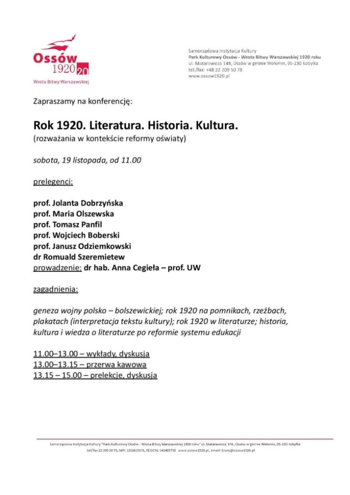 Na konferencję „Rok 1920. Literatura. Historia. Kultura” zaprasza 19 listopada, o godz. 11:00 samorządowa instytucja kultury Park Kulturowy Ossów - Wrota Bitwy Warszawskiej 1920 r.