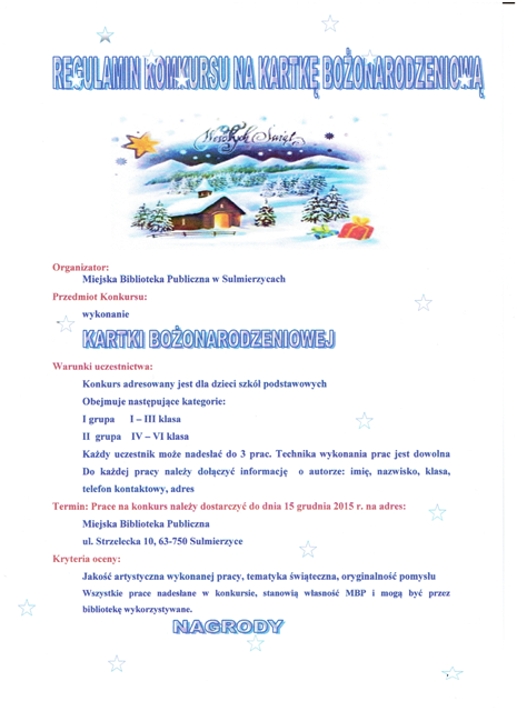 Miejska Biblioteka Publiczna w Sulmierzycach (powiat Krotoszyn) ogłasza konkurs na Kartkę Bożonarodzeniową. Konkurs adresowany jest do dzieci szkół podstawowych. Prace na konkurs należy nadsyłać do 15 grudnia 2015 roku.