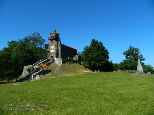 Usiedliśmy na chwilę, zjedliśmy kanapki i kabanosy. Następnie pochodziliśmy chwilę po terenie w celu sprawdzenia innych ciekawych rzeczy. Dowiedzieliśmy się, że wieża kościoła jest remontowana, że na pobliskim obszarze znajdują się miejsca starożytnego kultu, a baza noclegowa w obiekcie PTTK jest nieczynna. Podbiliśmy przy okazji pieczątki i zrobiliśmy zdjęcie z datą potrzebne do książeczki Korony Gór Polski. Do schodzenia wybraliśmy inny szlak. Najpierw, przez około 30 minut kolorem czerwonym. Ten odcinek prowadzi po kamieniach, bardziej stromo w dół, aż do samego Rozdroża Holtei’a. Tam jest nieco słabiej oznaczone odejście na szlak czarny, dlatego trzeba uważać. Jest to trzecia droga, którą miniemy. Zmieniliśmy od tej chwili kolor szlaku na czarny i tak zwanym Traktem Bolka schodziliśmy ku Przełęczy Tąpadła. Pozdrowiliśmy pracujących leśniczych i doszliśmy na pełną ludzi przełęcz. Po dojściu do samochodu zobaczyliśmy dwie wycieczki, a słychać ich było na długo przed naszym dojściem. Weszliśmy do samochodu i ruszyliśmy w kolejne pasmo, w Góry Kaczawskie.