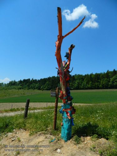 Na Skopiec zaplanowaliśmy wyjście z górnej części miejscowości Komarno. Podjechaliśmy za szlakiem żółtym, aż do miejsca gdzie kończy się asfaltowa droga i tam na poboczu zostawiliśmy samochód. Była godzina 12, czyli upał nie do wytrzymania. Ogólnie przez pierwsze dni nie szło wytrzymać, ale za to widoki były piękne. Ruszyliśmy szlakiem żółtym w stronę Skopca. Wyjście będzie nieco skomplikowane, bo na szczyt nie prowadzi żaden szlak, ale postaram się dokładnie wyjaśnić co i jak. Po około 5 minutach dochodzimy do takiego kolorowego drzewa, na którym są zawieszone różnego rodzaju buty.