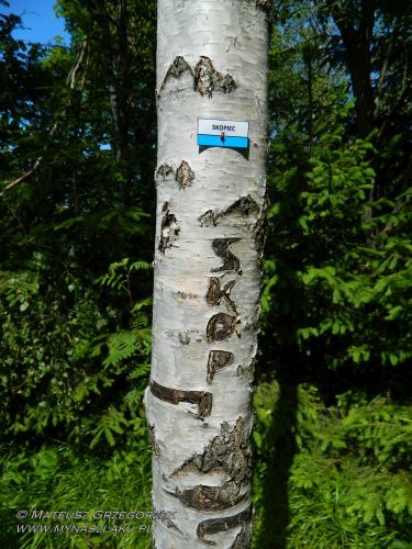 Teraz należy iść bez szlaku na drogę najbardziej na prawo, czyli tak jakby naprzeciwko tego drzewa. Po jakichś 20 minutach marszu dojdziemy do szlaku niebieskiego i idziemy z nim w lewo. Po tym jak dojdziemy na najwyższy punkt, po prawej zobaczymy drogę na Baraniec (720 m) i gdy otworzą nam się widoki to skręcamy na ubitą drogę w lewo. Na drugim drzewie będzie przyklejona maleńka niebiesko-biała tabliczka z napisem Skopiec. Musimy iść przed siebie przez około kilkadziesiąt metrów i w pewnym momencie odejść w lewo. Ciężko będzie to odejście przegapić, ponieważ na drzewie są namalowane białe strzałki, a droga tam jest , że tak powiem przeorana przez zdobywców KGP :). Dojdziemy na najwyższy szczyt Gór Kaczawskich i ujrzymy kopiec z kamieni i wyryty na drzewie napis Skopiec.